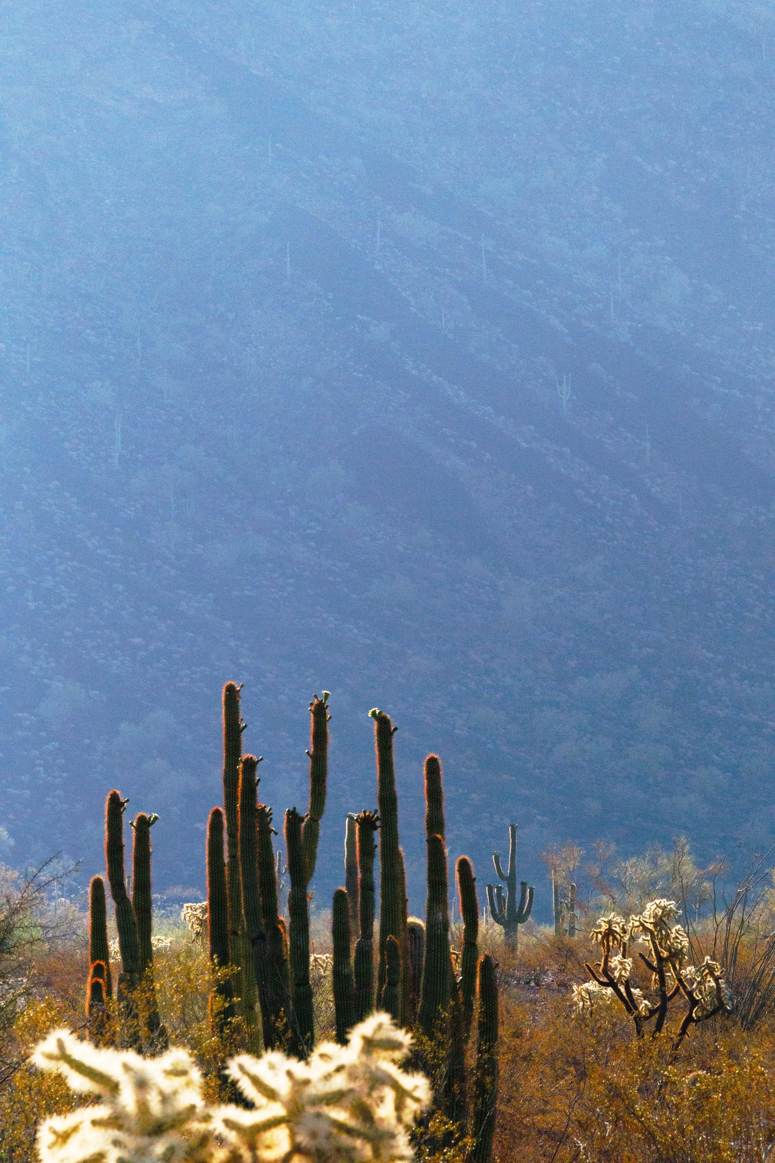 Fun photography note—the cacti in the foreground of this photo are being lit up by sunshine, and a cloud is blocking sun rays from hitting the mountain in the background, which causes it look silhouetted in this photo.